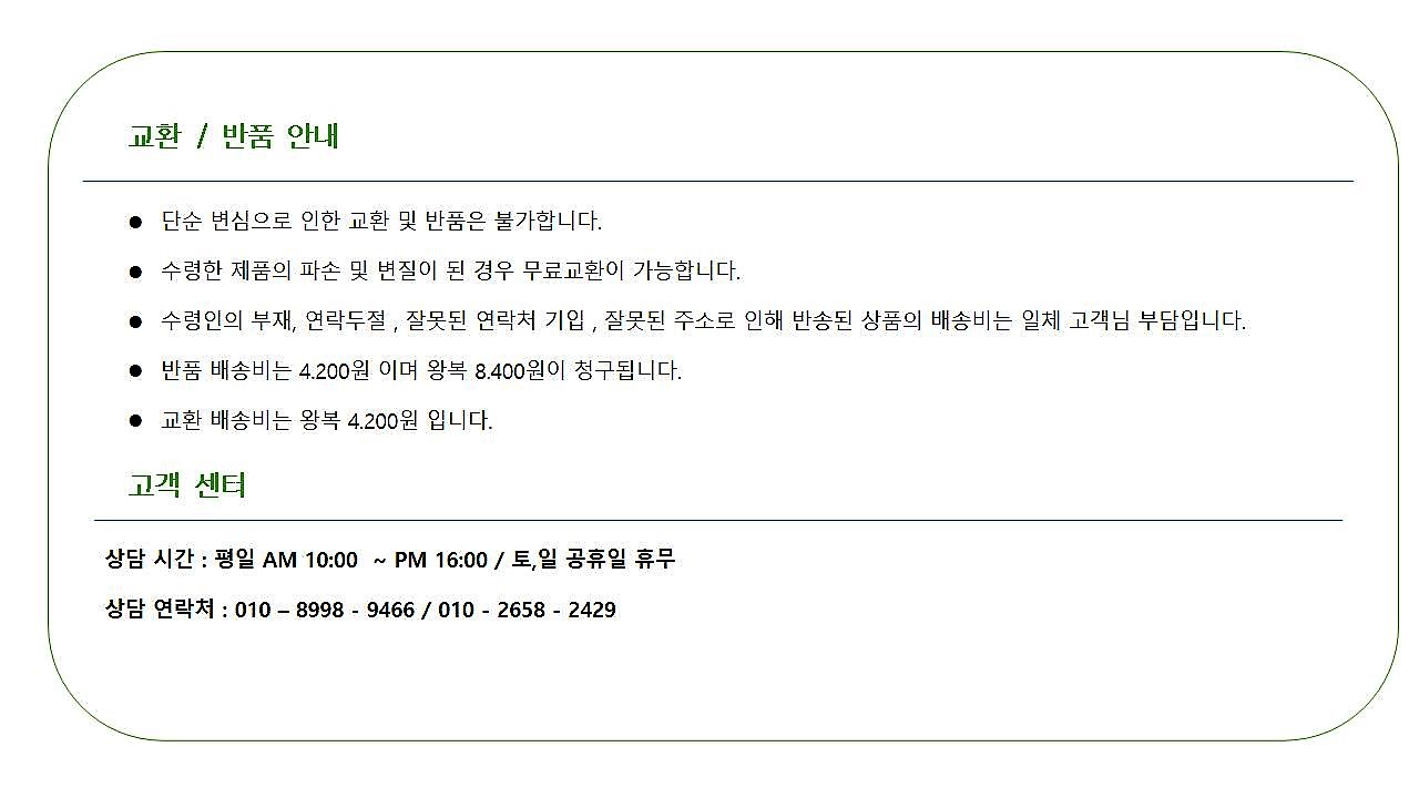 3.클레임 (반품,교환 등) 수령 후 24시간 이내에 문의 및 접수 해주셔야 처리 가능합니다.