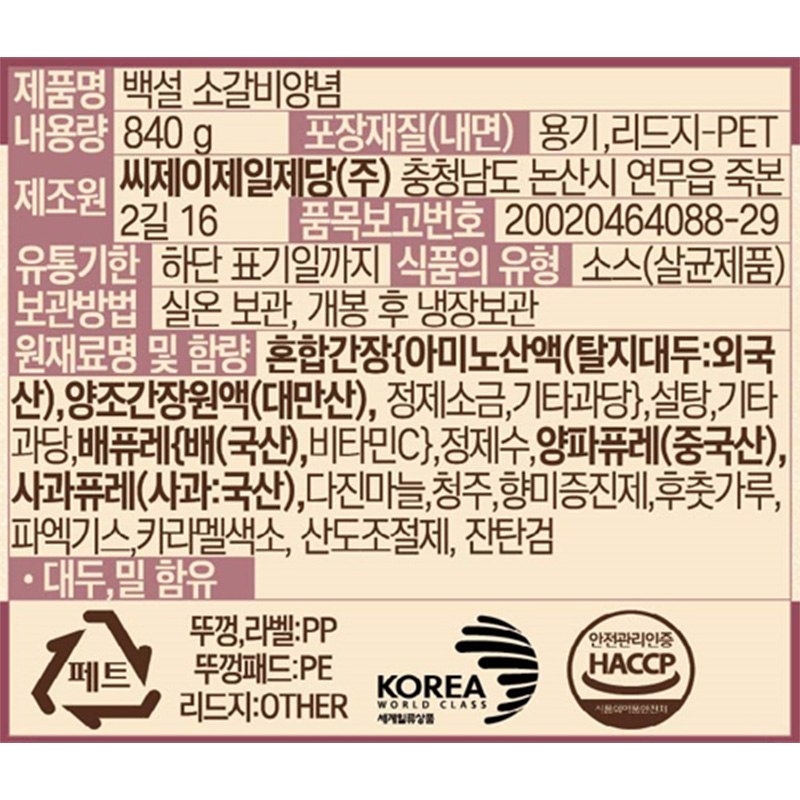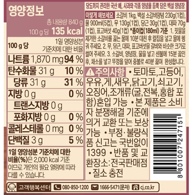 백설 소갈비양념(사과배_12입 840g/EA)