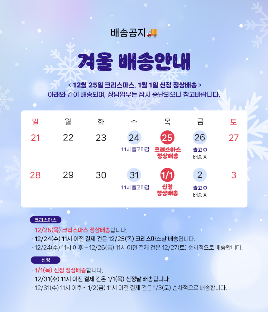 • 택배배송의 경우, 주말 및 공휴일 전일 및 당일에는 상품 발송이 어려울 수 있습니다.