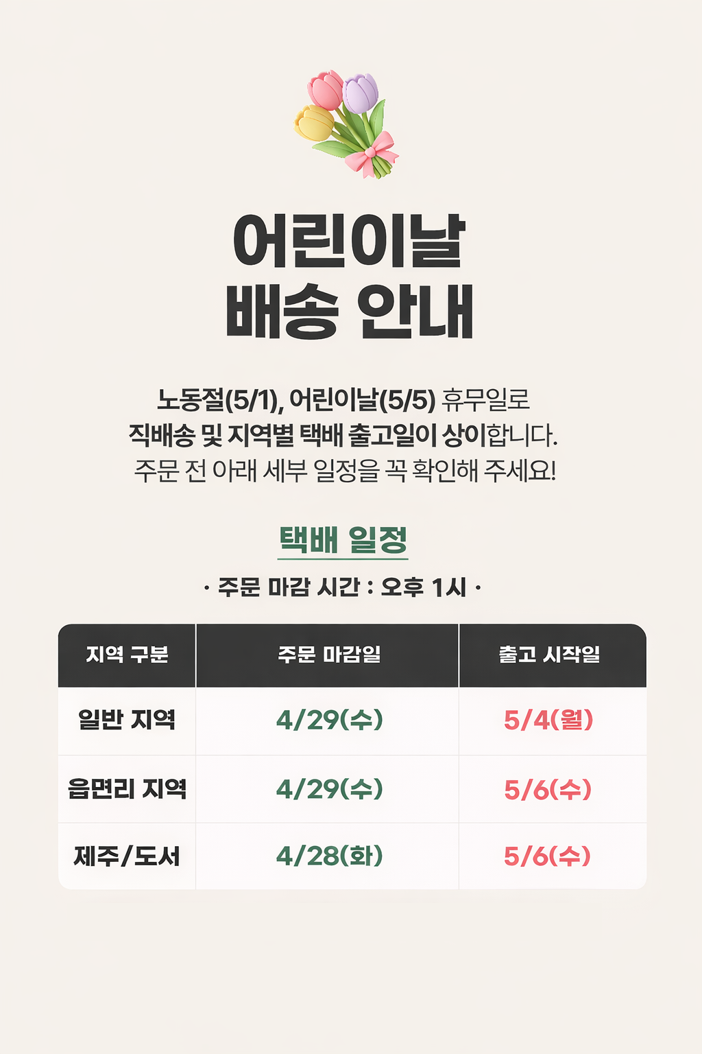 ※ 제주, 도서산간지역의 경우 추가배송비 발생될 수 있으며 주문 확인 후 추가 금액 입금 관련하여 안내드릴 예정입니다.