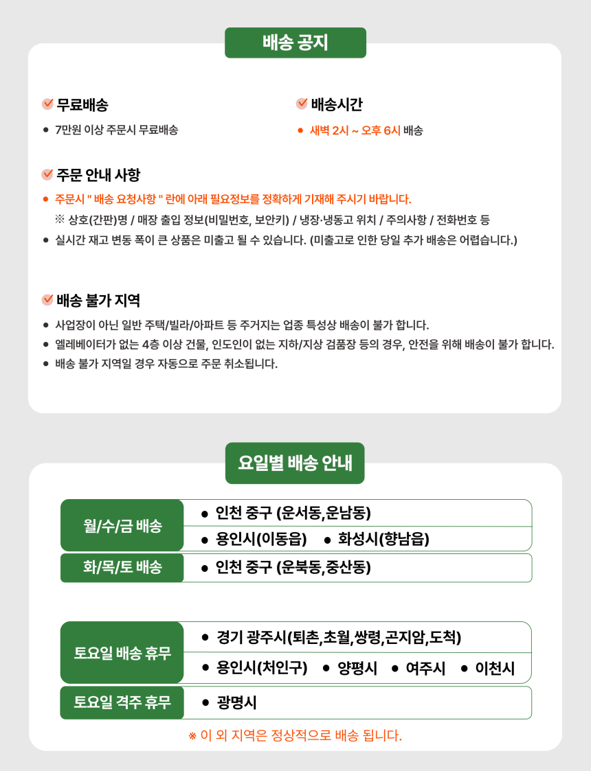• 택배배송의 경우, 주말 및 공휴일 전일 및 당일에는 상품 발송이 어려울 수 있습니다.
