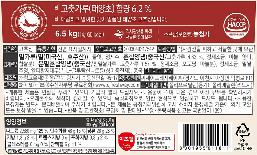 이츠웰 고추장(태양초 6.5Kg/EA)