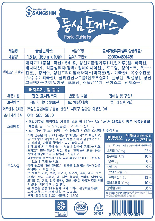 상신 통등심돈까스(150g*10입 1.5Kg/EA)