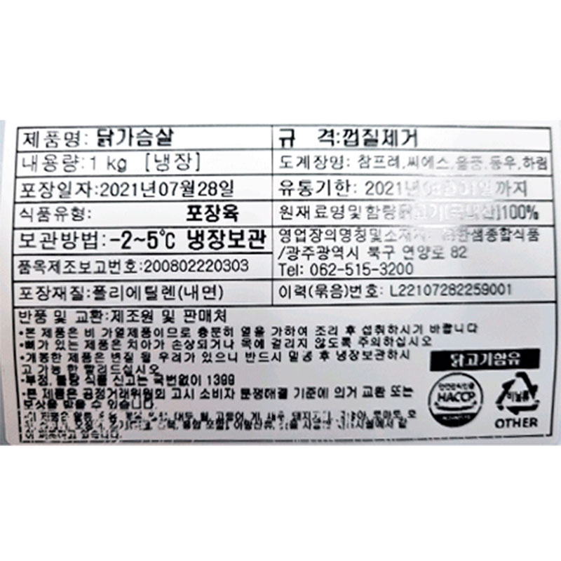 한샘종합식품 닭가슴살(껍질제거 KG)/국내산 이미지