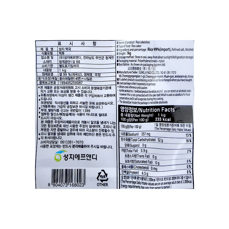 성지에프앤디 떡국떡(1Kg/EA)