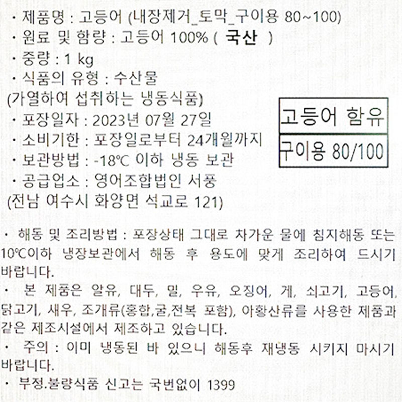 서풍 고등어(내장제거_80~100g/토막 구이용 1Kg/EA)/국내산