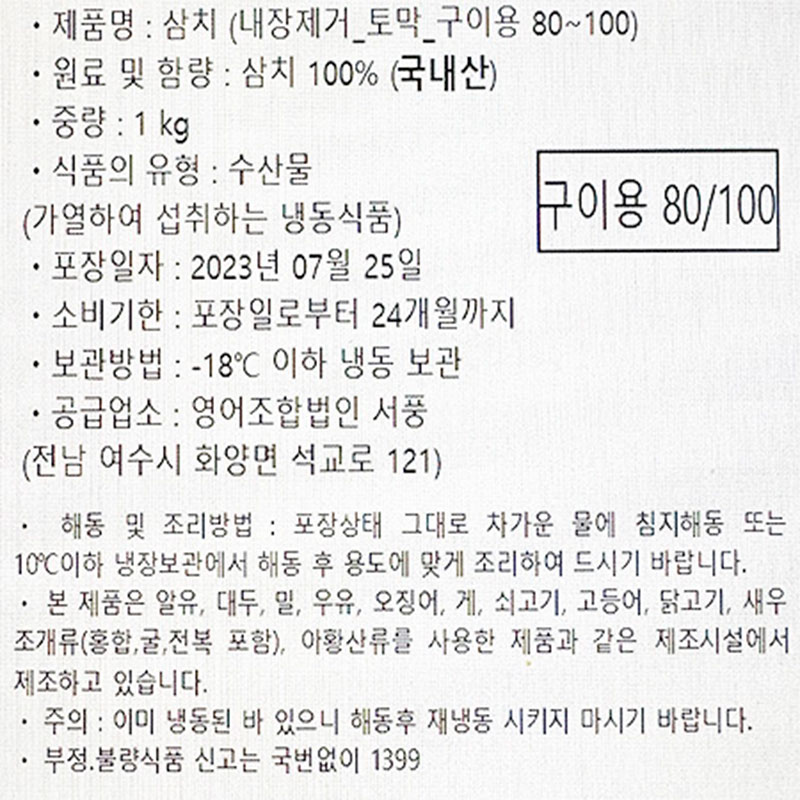 서풍 삼치(내장제거_80~100g/토막 구이용 1Kg/EA)/국내산 이미지