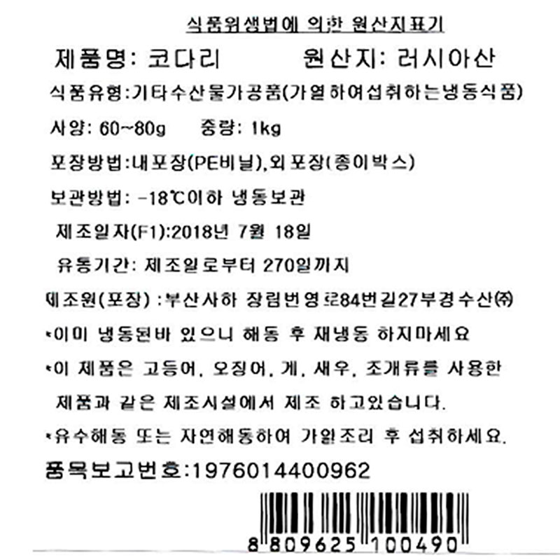 코다리(절단_60~80g/토막 마트용 1Kg/EA)/러시아산