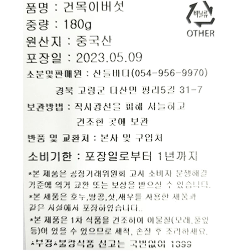 산들 건목이버섯(180g/EA)/중국산 이미지