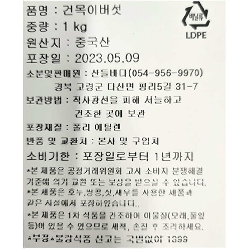 산들 건목이버섯(1Kg/EA)/중국산 이미지