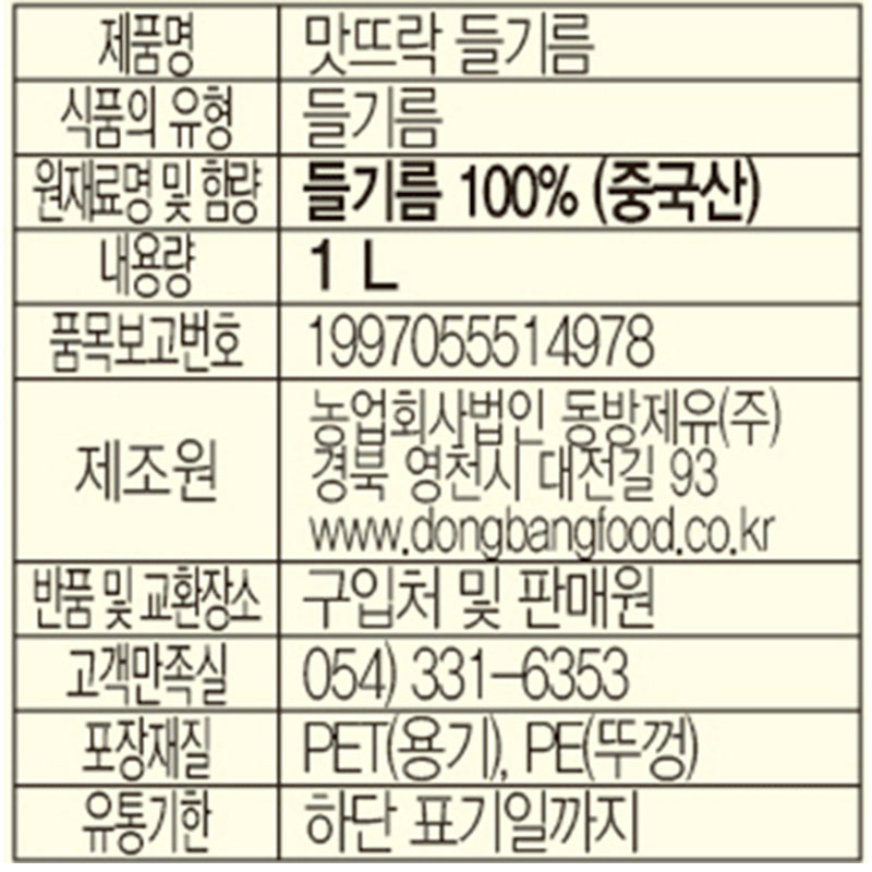 맛뜨락 들기름(PET_1L 1Kg/EA) 이미지