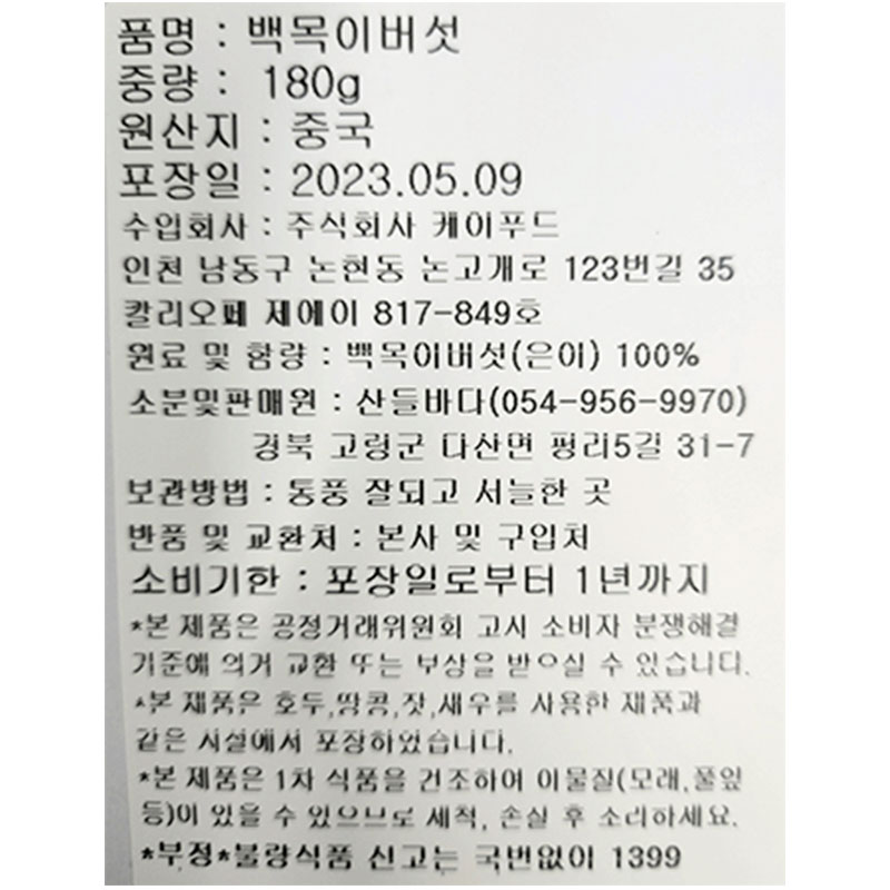 산들 건백목이버섯(180g/EA)/중국산 이미지