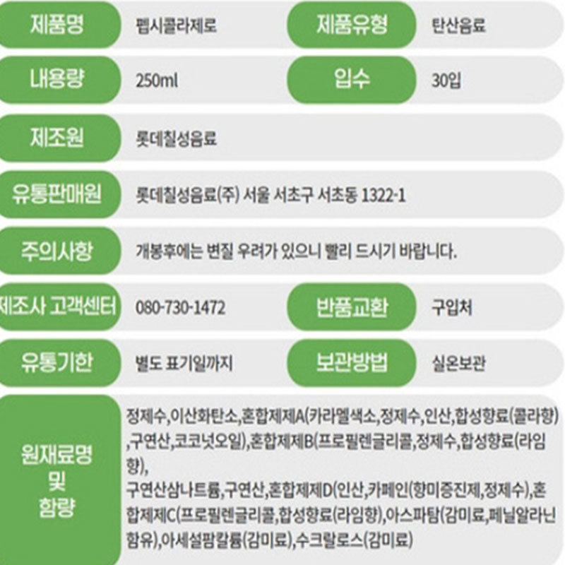 펩시 콜라(250ml_제로슈거 250g*30EA/BOX)