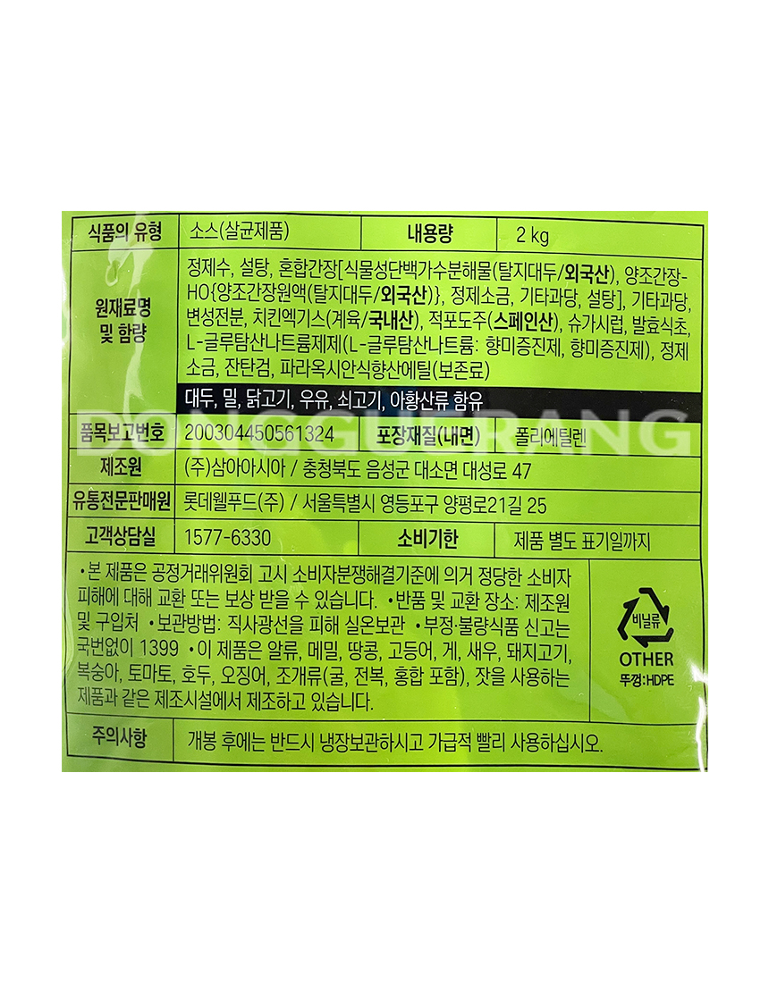 롯데 데리야끼소스(SP) 스파우트 파우치 2Kg