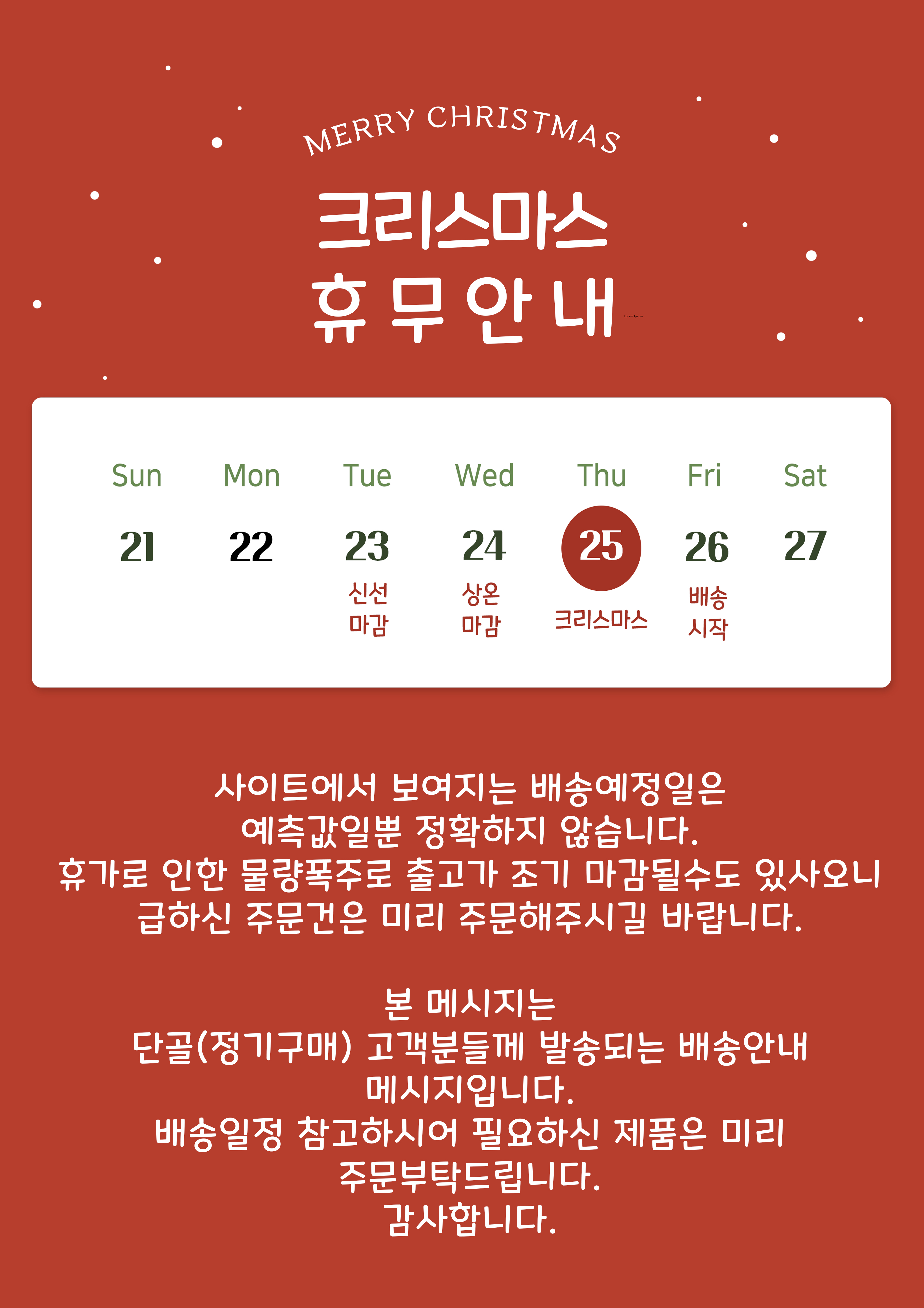 성탄절 연휴로 인해 택배발송이 조기마감됩니다.