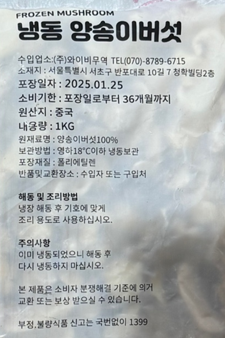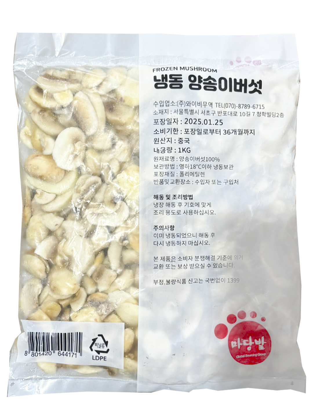 마당발 양송이버섯 슬라이스 1kg 냉동 양송이100% 중국산 피자 토핑 볶음밥