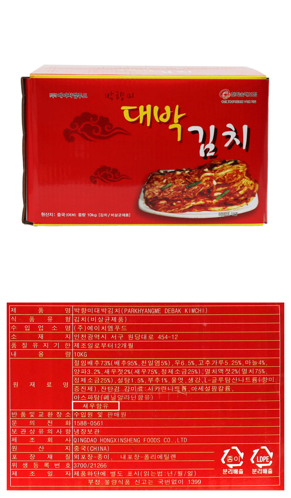 절임배추 73%(배추 95%, 천일염 5%), 무 6.5%, 고추가루 5.25%, 마늘 4%, 양파 3.2%, 새우젓 2%(새우 75%, 정제소금 25%), 멸치액젓 2%(멸치 75%, 정제소금 25%), 잔탄검 / 감미료 : 사카린나트륨, 아세설팜칼륨, 아스파탐(페닐알라닌 함유) * 새우 함유