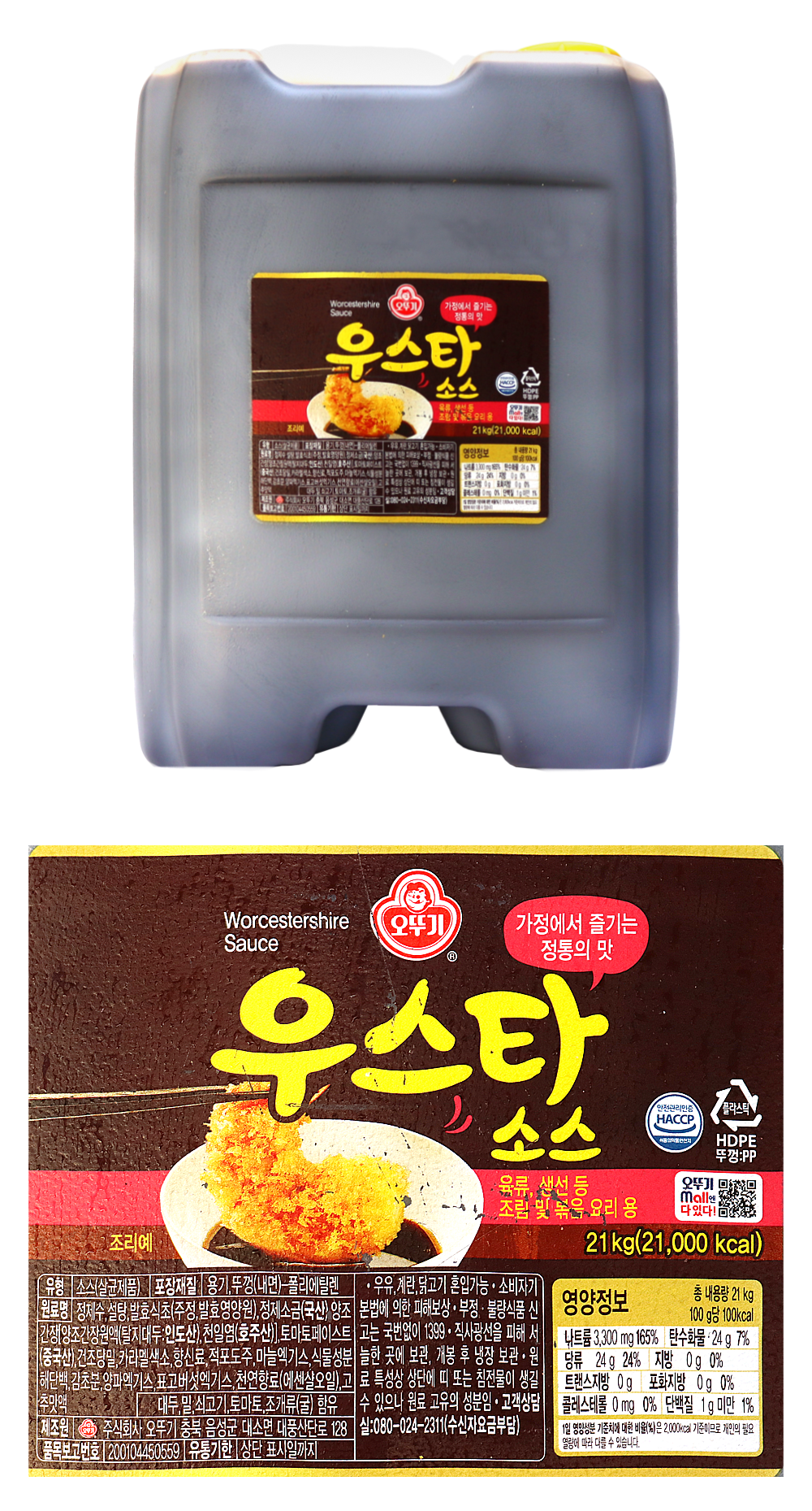 정제수, 설탕, 발효식초(주정, 발효영양원), 정제소금(국산), 양조간장(양조간장원액(탈지대두 : 인도산), 천일염(호주산)), 토마토페이스트(중국산), 건조당밀, 카라멜색소, 향신료, 적포도주, 마늘엑기스, 식물성분해단백, 감초분, 양파엑기스, 표고버섯엑기스, 천연향료(에센셜오일), 고추맛액 * 대두, 밀, 쇠고기, 토마토, 조개류(굴) 함유