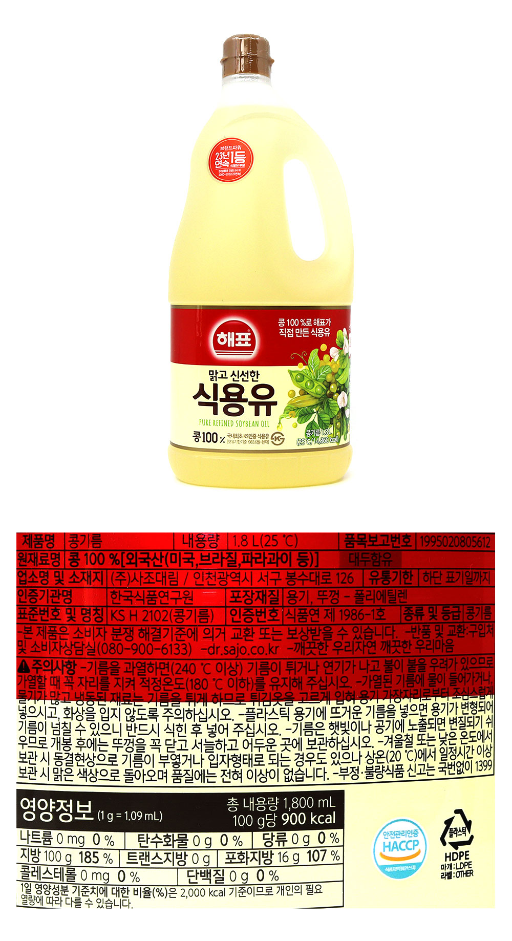 ★특가★ 해표 콩식용유 1.8L 식용유 이미지
