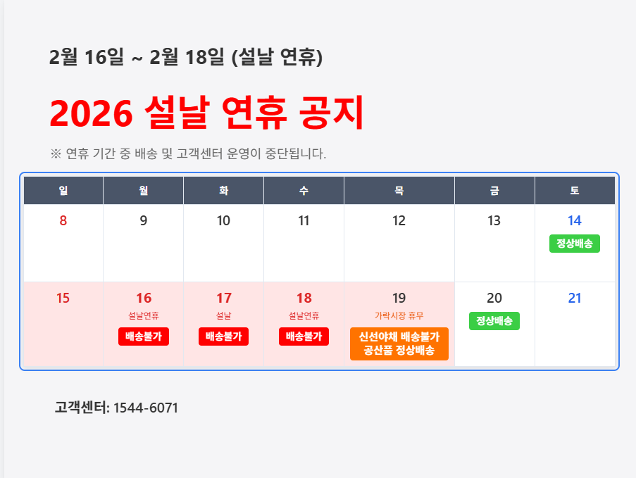 • 택배배송의 경우, 주말 및 공휴일 전일 및 당일에는 상품 발송이 어려울 수 있습니다.