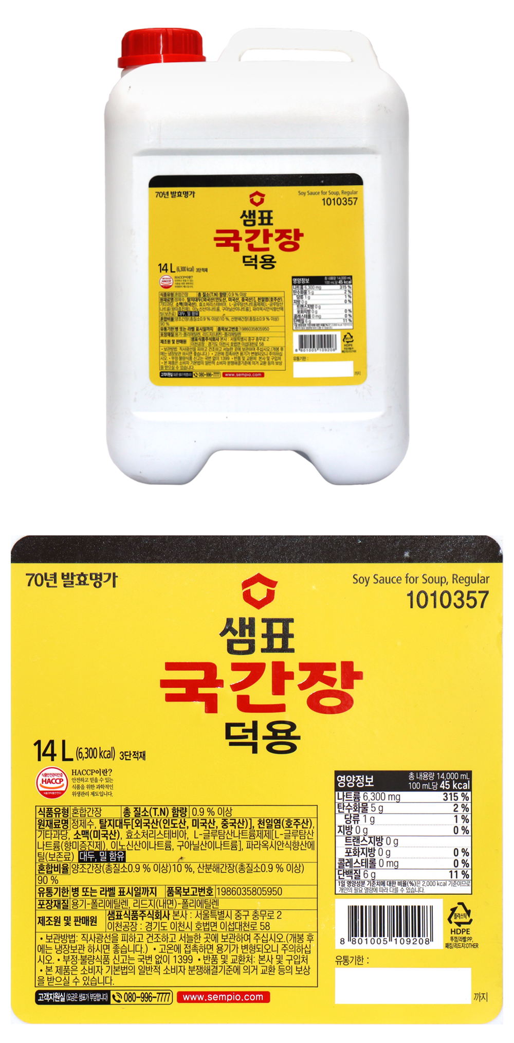 정제수, 탈지대두(외국산(인도산, 미국산, 중국산)), 천일염(호주산), 기타과당, 소맥(미국산), 효소처리스테비아, L-글루탐산나트륨제제(L-글루탐산나트륨(향미증진제), 이노신산이나트륨, 구아닐산이나트륨), 파라옥시안식향산에틸(보존료) * 대두, 밀 함유