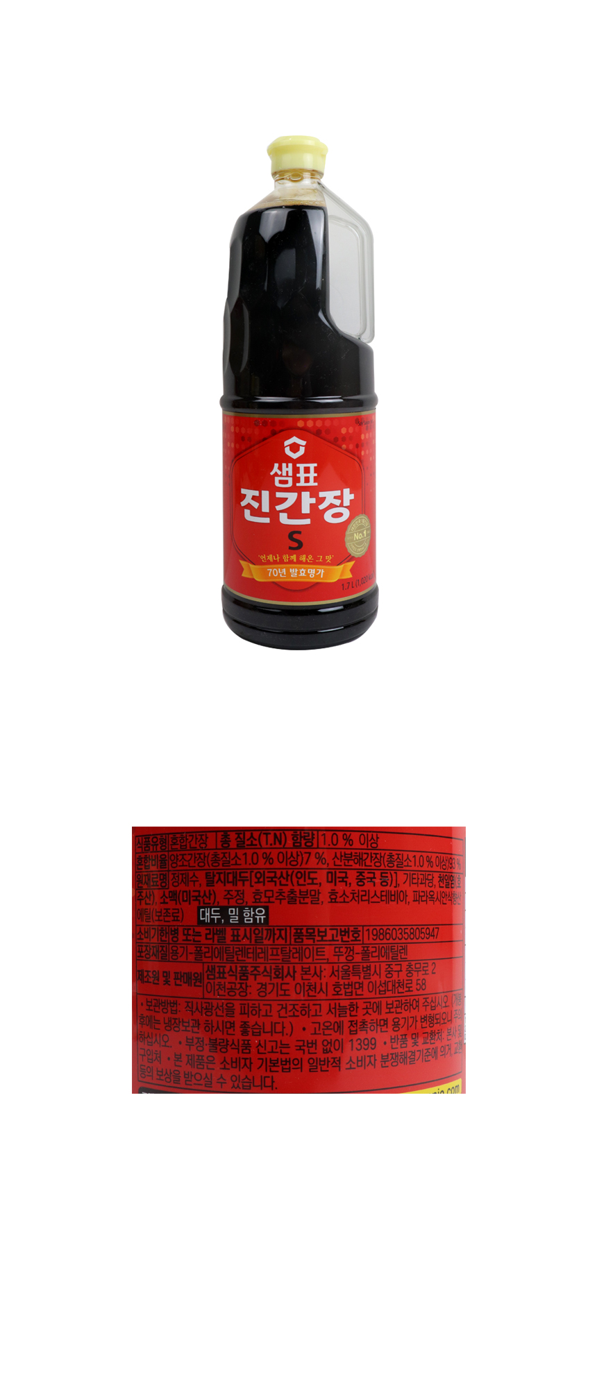 정제수, 탈지대두(외국산(인도, 미국, 중국 등)), 천일염(호주산), 소맥(미국산), 기타과당, 효모추출분말, 효소처리스테비아, 감초추출물, 주정, 파라옥시안식향산에틸(보존료) * 대두, 밀, 함유
