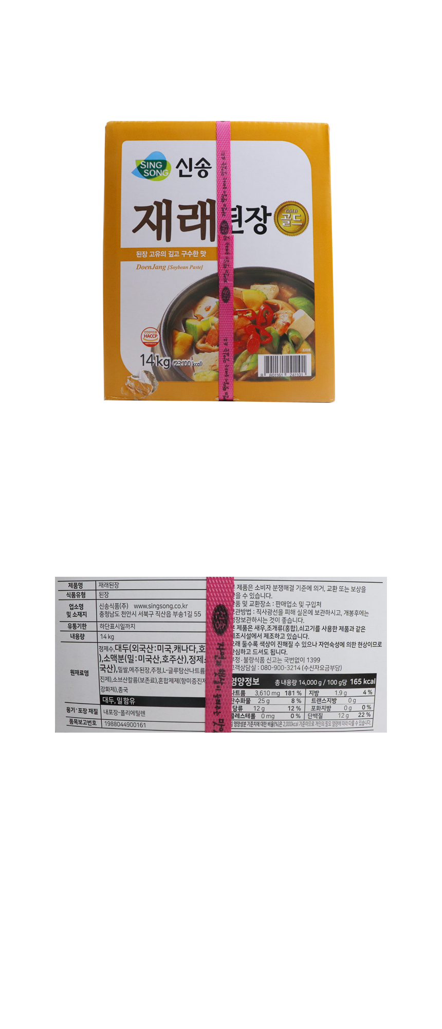 정제수, 대두(외국산: 미국, 캐나다, 호주), 소맥분(밀: 미국산, 호주산), 정제수(국산), 밀쌀, 메주된장, 주정, L-글루탐산나트륨, 소브산칼륨(보존료), 혼합제제(향미증진제, 강화제), 종국 * 대두, 밀 함유