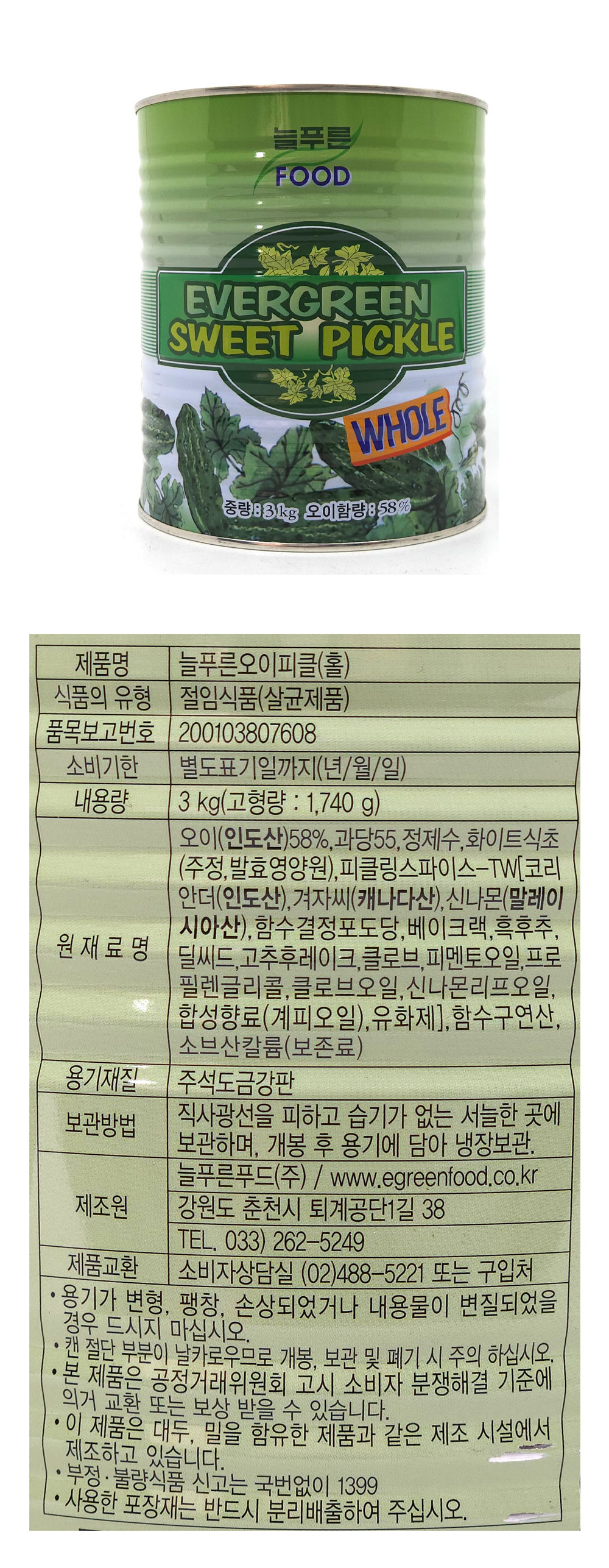 늘푸른오이피클(홀) 3kg
