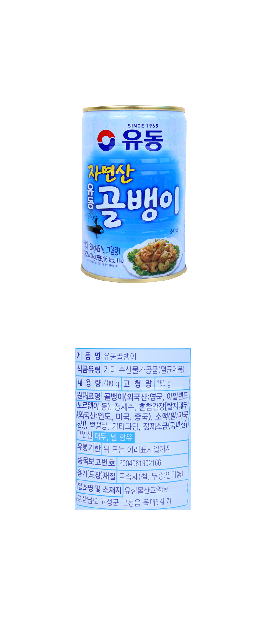 골뱅이(외국산 : 영국, 아일랜드, 노르웨이 등), 정제수, 혼합간장(탈지대두(외국산: 인도, 미국, 중국), 소맥(밀: 미국산)), 백설탕, 기타과당, 정제소금(국내산), 구연산