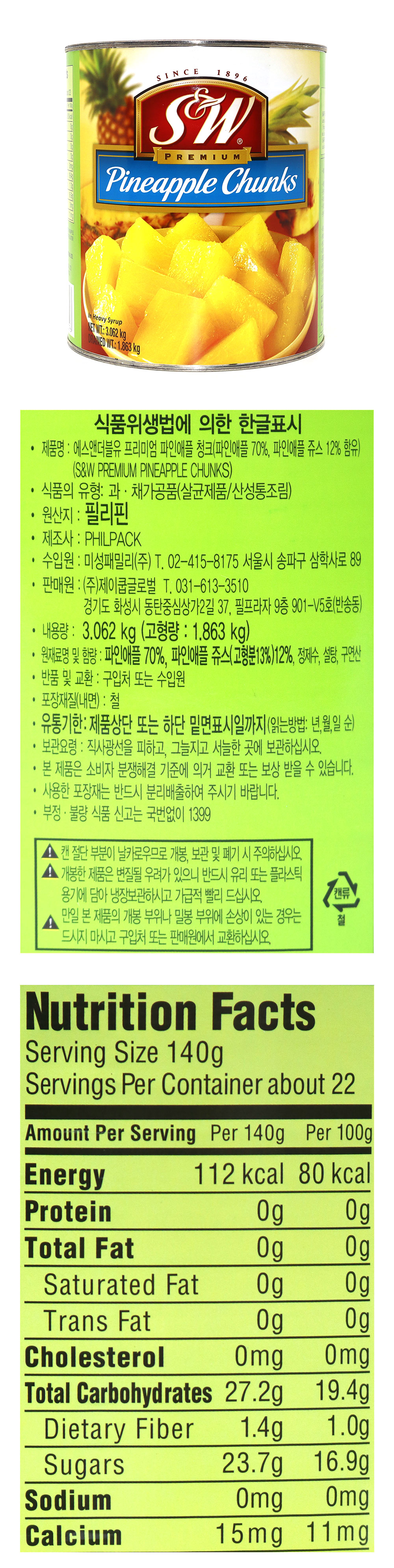 파인애플 70%, 파인애플쥬스(고형분 13%) 12%, 정제수, 설탕, 구연산