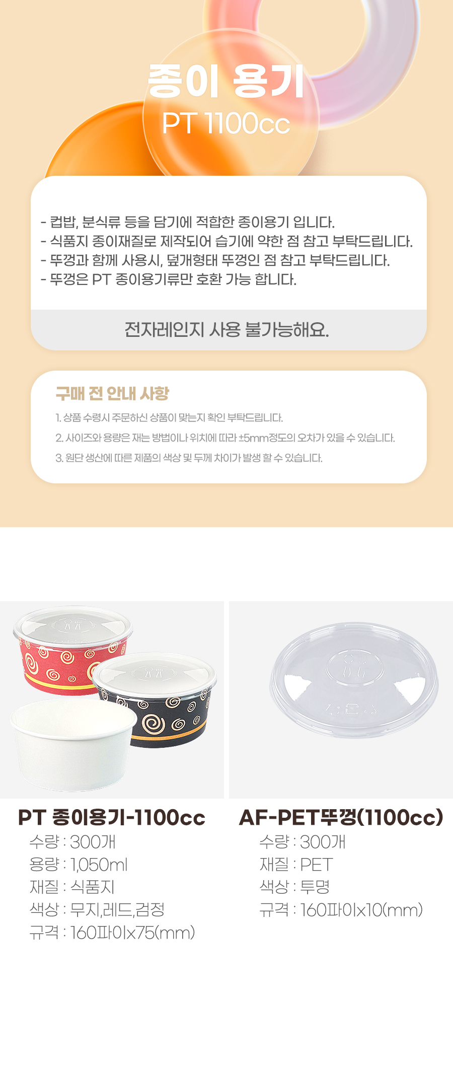 [PT] 일회용 1100CC 종이용기 무지 300개세트(뚜껑_AF투명뚜껑)