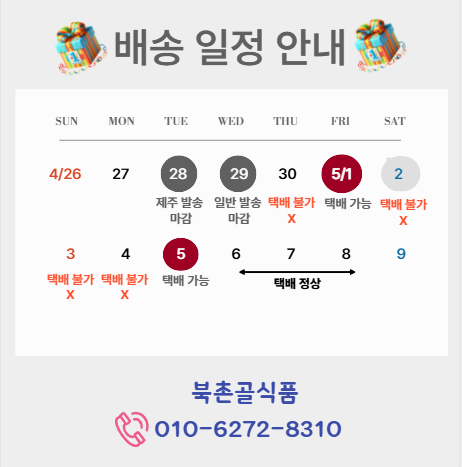 - 택배 배송 : 당일 2시까지 주문건 당일택배 발송(주말.공휴일제외)