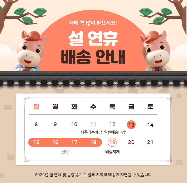 - 택배 배송 : 당일 2시까지 주문건 당일택배 발송(주말.공휴일제외)