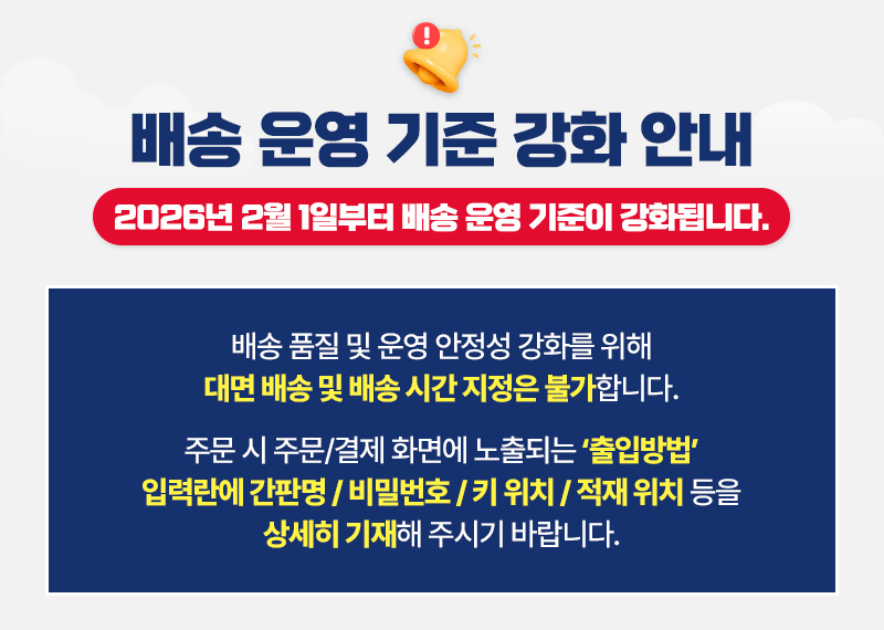 • 택배배송의 경우, 주말 및 공휴일 전일 및 당일에는 상품 발송이 어려울 수 있습니다.