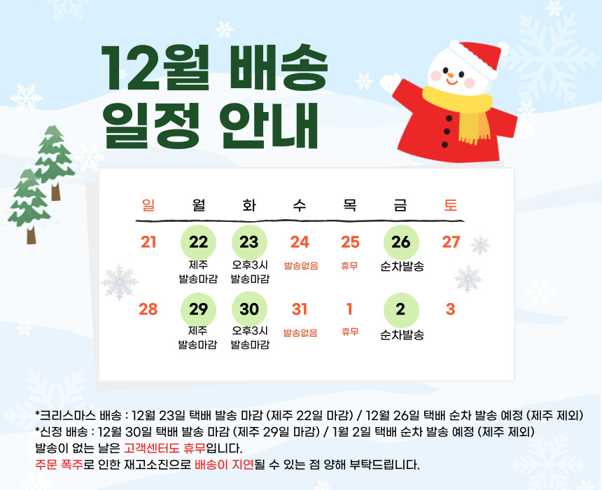 • 택배배송의 경우, 주말 및 공휴일 전일 및 당일에는 상품 발송이 어려울 수 있습니다.