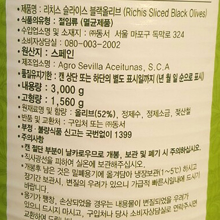 리치스 올리브(블랙_슬라이스 3.05Kg/EA) 이미지