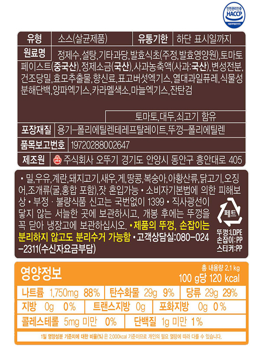 오뚜기 돈까스소스(PET 2.1Kg/EA)