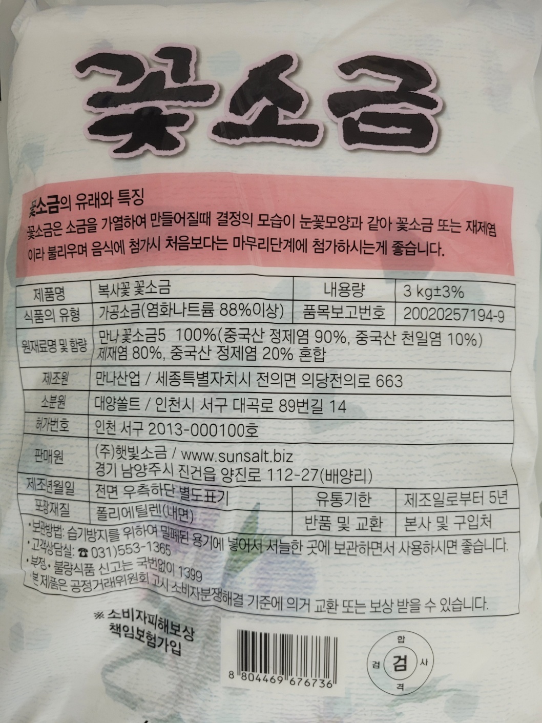 소금(수입/꽃소금/고운재렴/복사꽃/햇빛)3kg