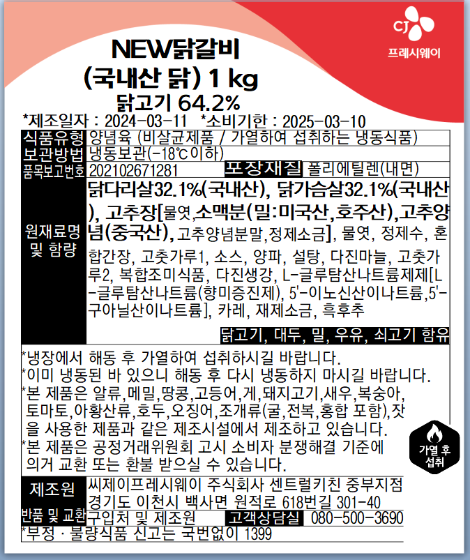 <간편조리>CJ 닭갈비 (냉동 국내산닭_1Kg/EA) 업소용 반찬 이미지