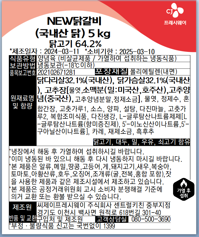 <간편조리>CJ 닭갈비 (냉동 국내산닭_5Kg/EA) 업소용 반찬 이미지