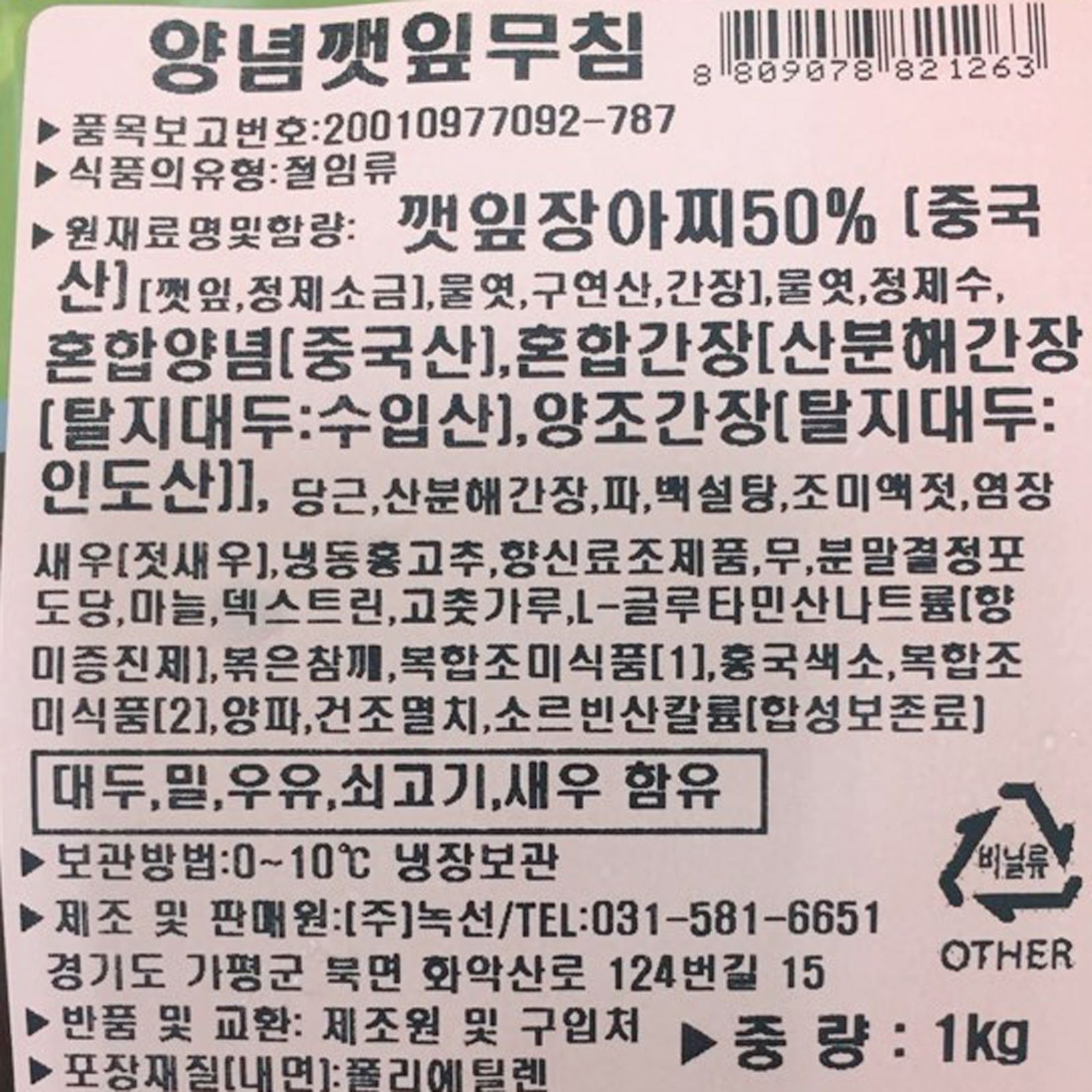 녹선 양념깻잎무침(고형량50% 1Kg/EA) 업소용 반찬