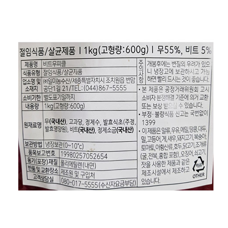 일미농수산 비트무피클(무55% 1Kg/EA) 업소용 반찬