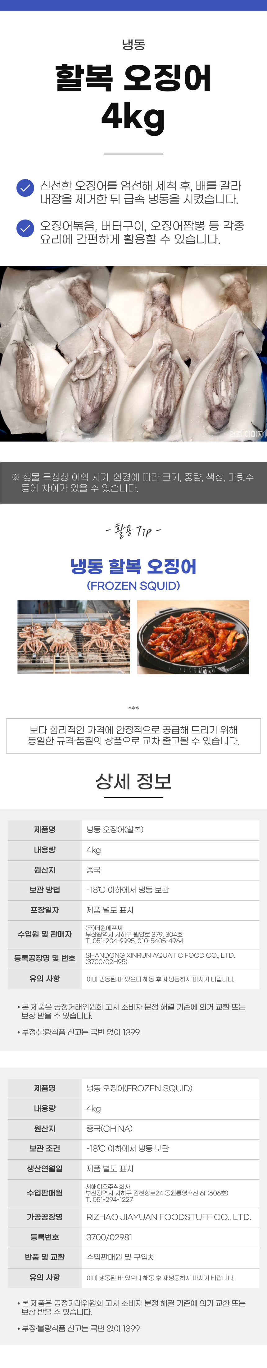 할복 오징어 4kg 중국산 손질