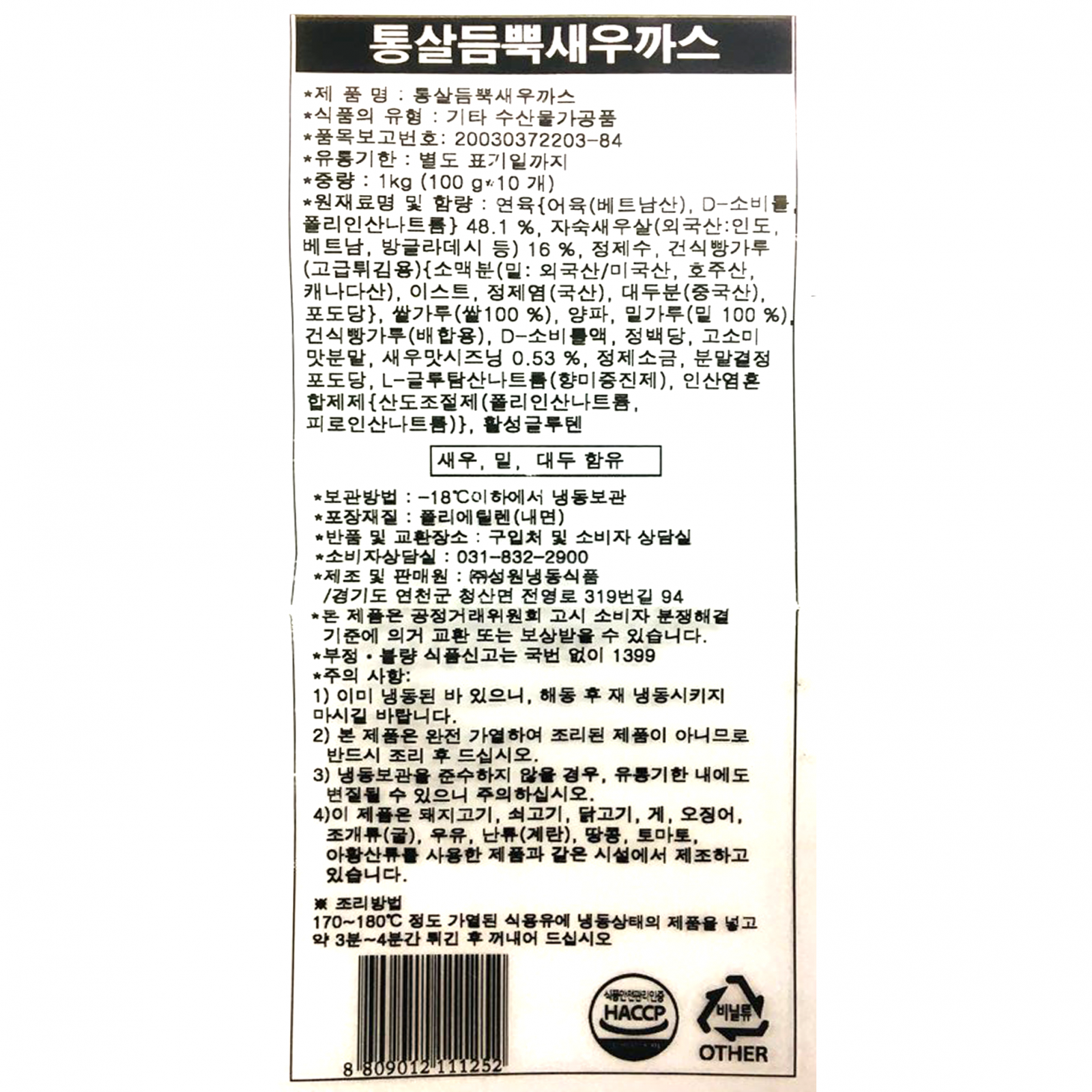성원냉동식품 통살듬뿍새우까스(100g*10입 1Kg/EA)