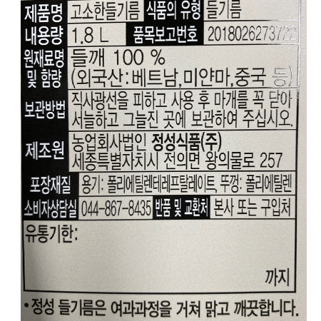 정성식품 고소한들기름(1.8Kg/EA) 이미지