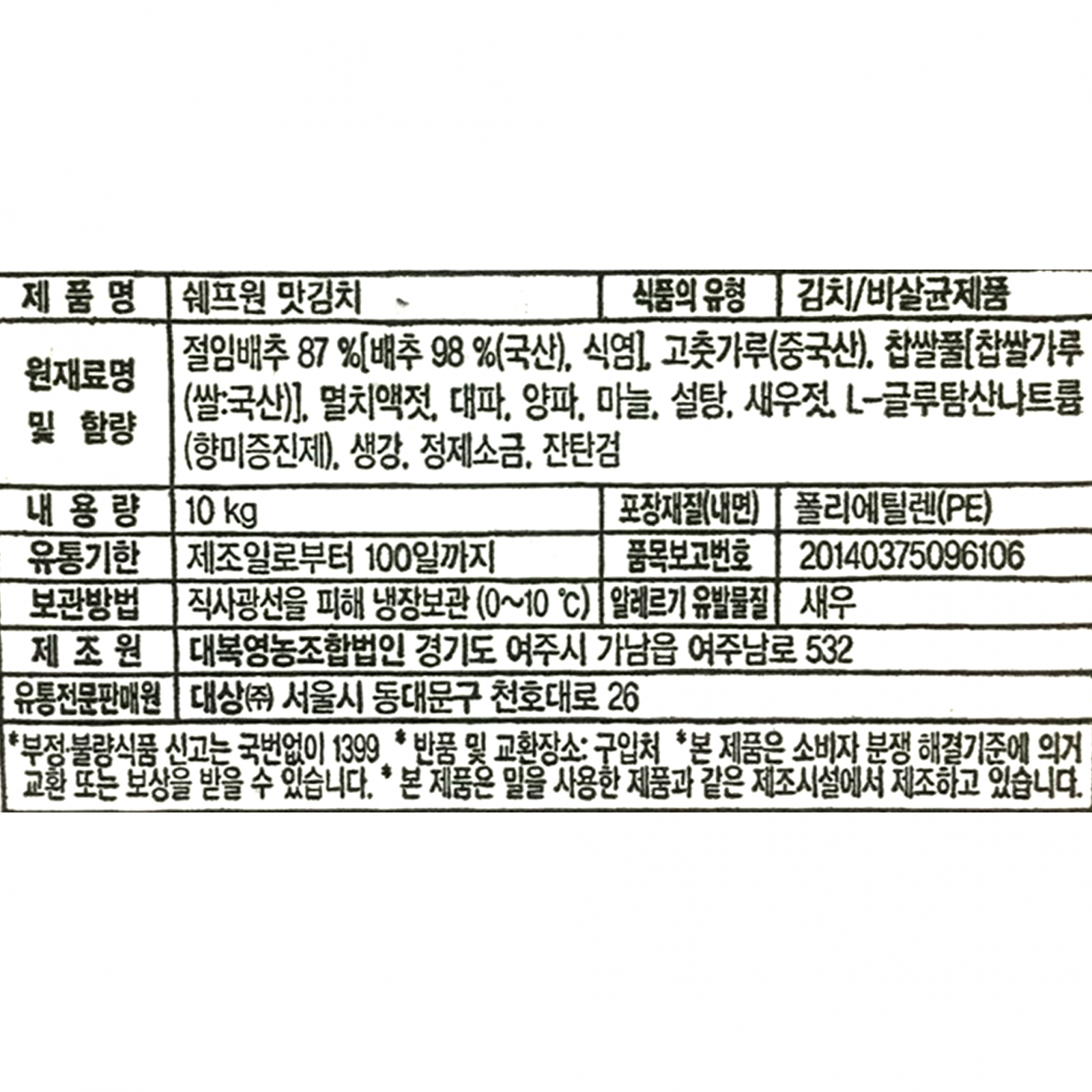 쉐프원 맛김치(일반_생 10Kg/BOX) 업소용 반찬 이미지