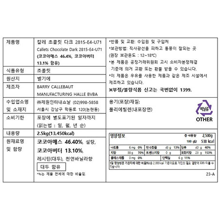 칼리바우트 다크초콜릿(버튼_57.7% 2.5Kg/EA) 커버춰 이미지