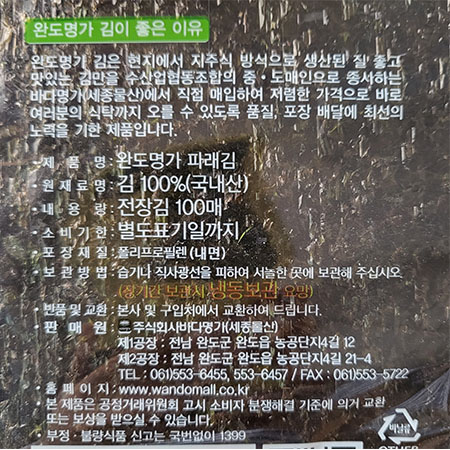 완도명가 파래김(지주식_생김_남도미향인증_100매 200g/EA)