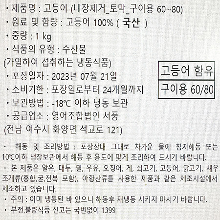서풍 고등어(내장제거_60~80g/토막 구이용 1Kg/EA)
