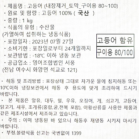 서풍 고등어(내장제거_80~100g/토막 구이용 1Kg/EA)